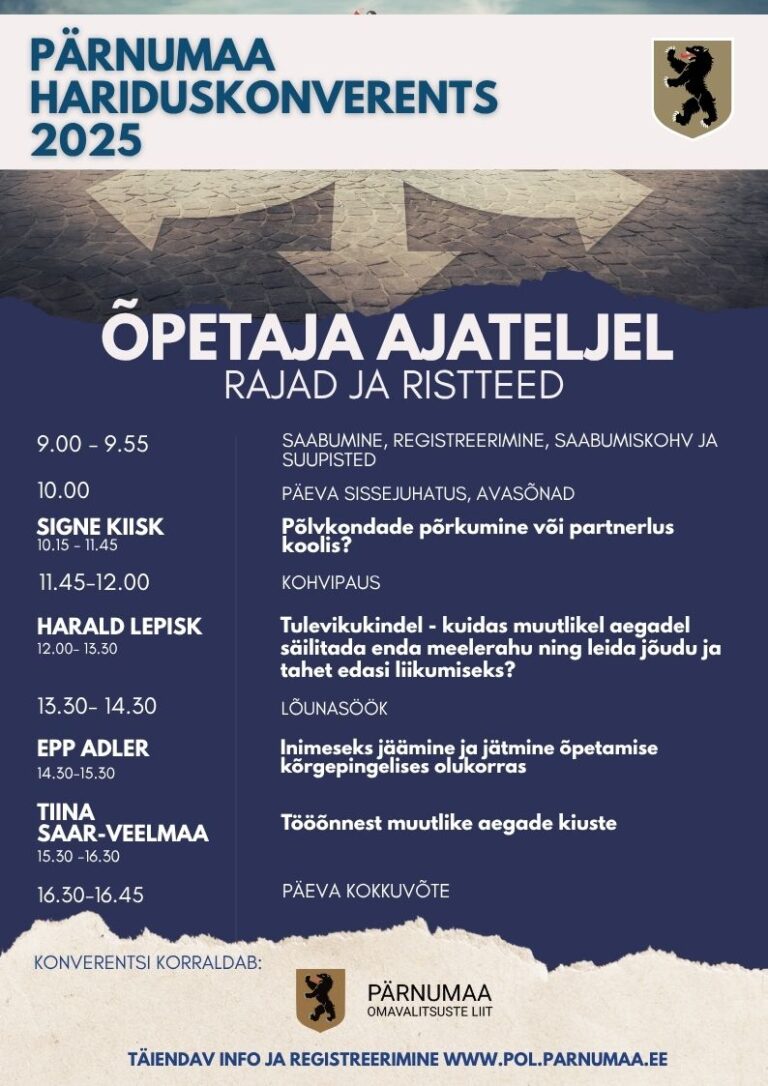 Ootame Sind Pärnumaa hariduskonverentsile, mis toimub 21.10.2025 (kell 9.00-16.45) Hestia Hotel Strandi Jurmala saalis. Põnevad teemad toovad teieni Signe Kiisk, Epp Adler, Tiina Saar-Veelmaa ja Harald Lepisk!